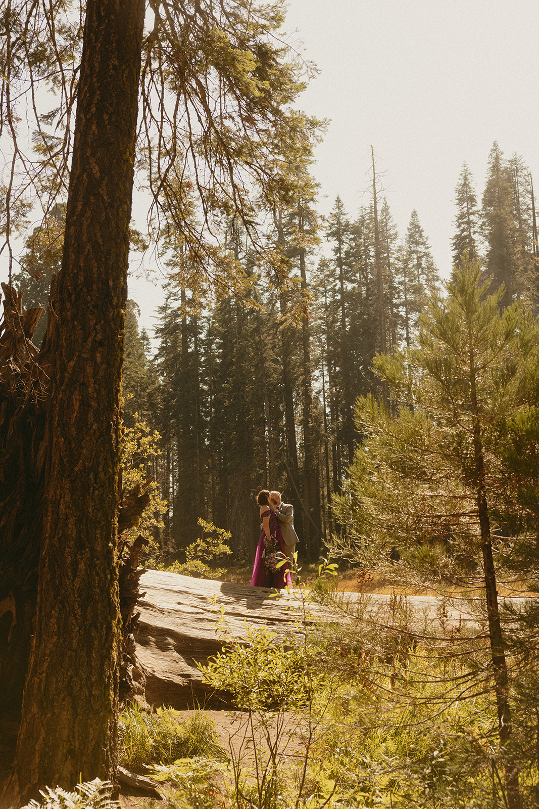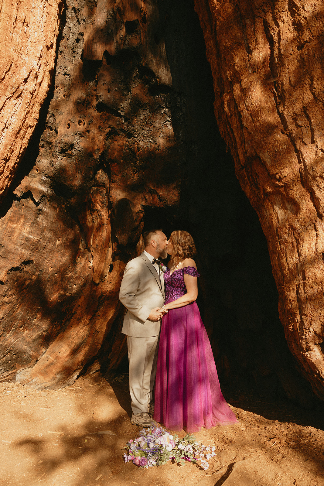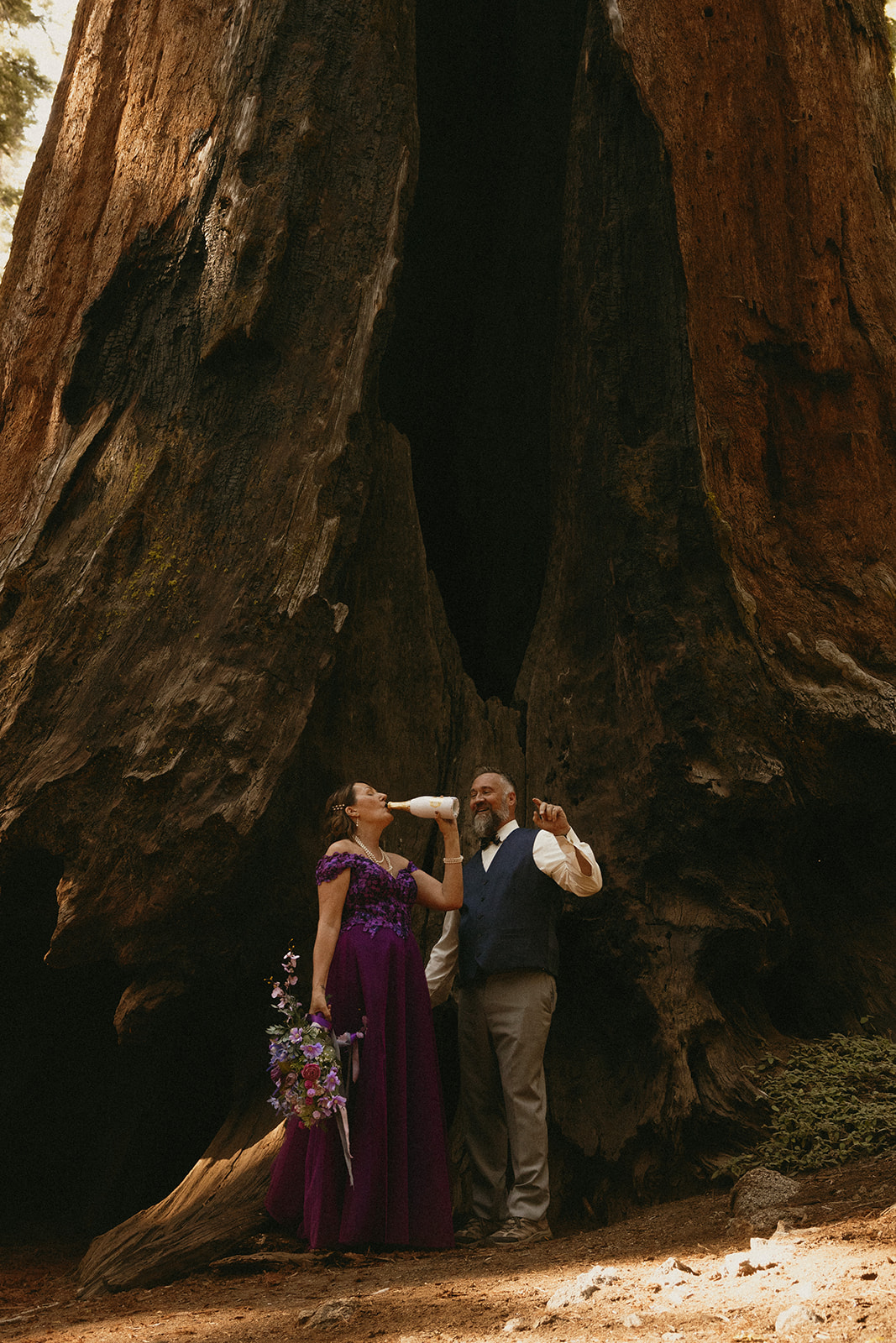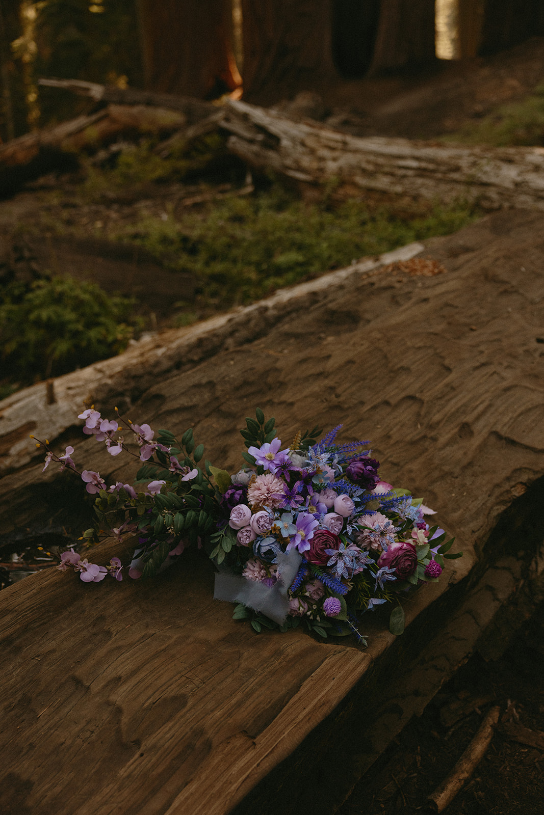Lol of course there was tree hugging, we were in a forest with the biggest trees in the world after all! After Barbara and Ray said their vows, we wandered a little deeper into the greenery for portraits—and can I just say, I was obSESSED with Barbara’s purple gown. The way the vibrant shades of purple popped against the greenery all around us… 10/10 would recommend wearing a colorful elopement dress. Bonus points if you coordinate your color of choice with your florals like Barbara did, I was drooooling over the gorgeous purples, violets, and blues in her dreamy bouquet.