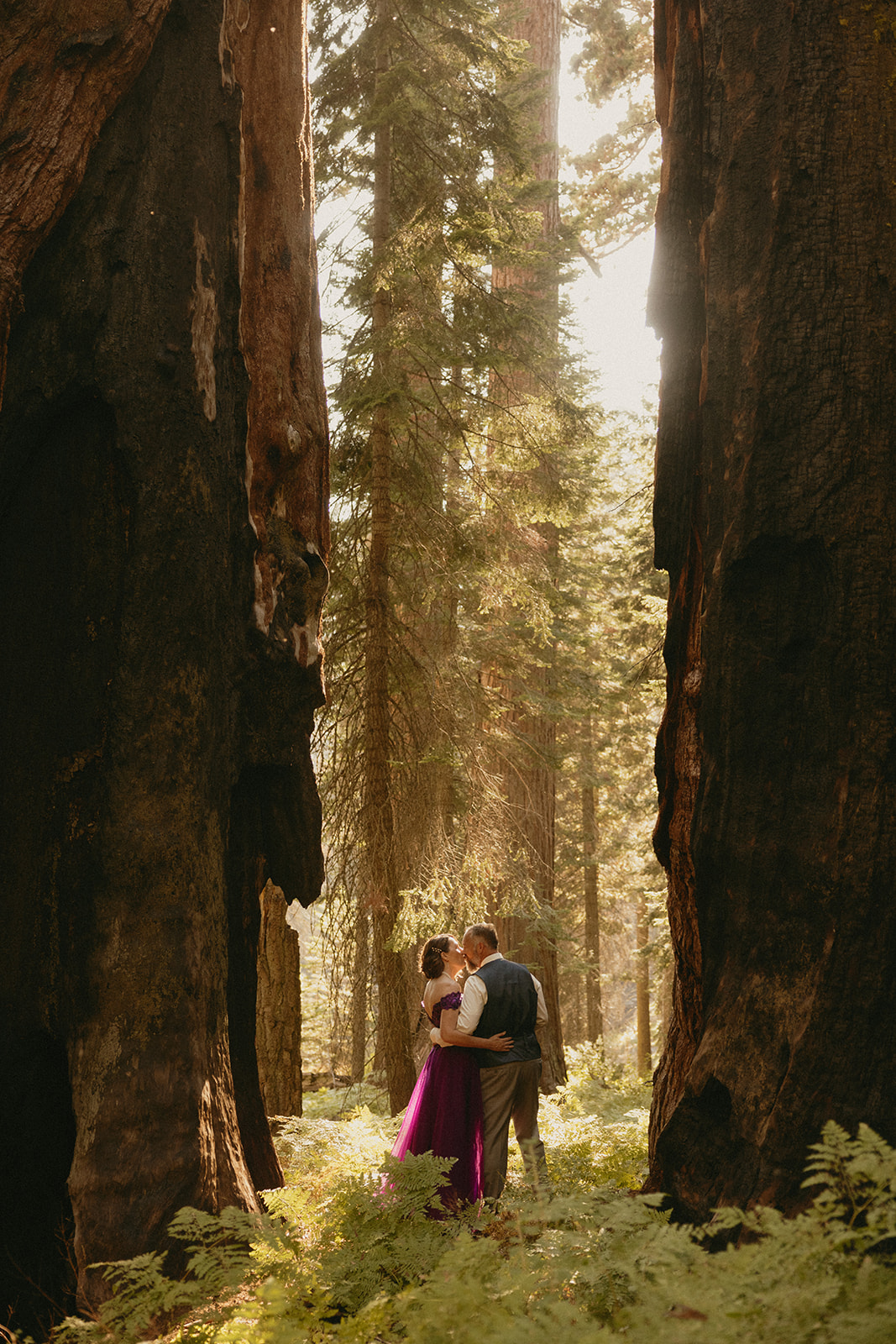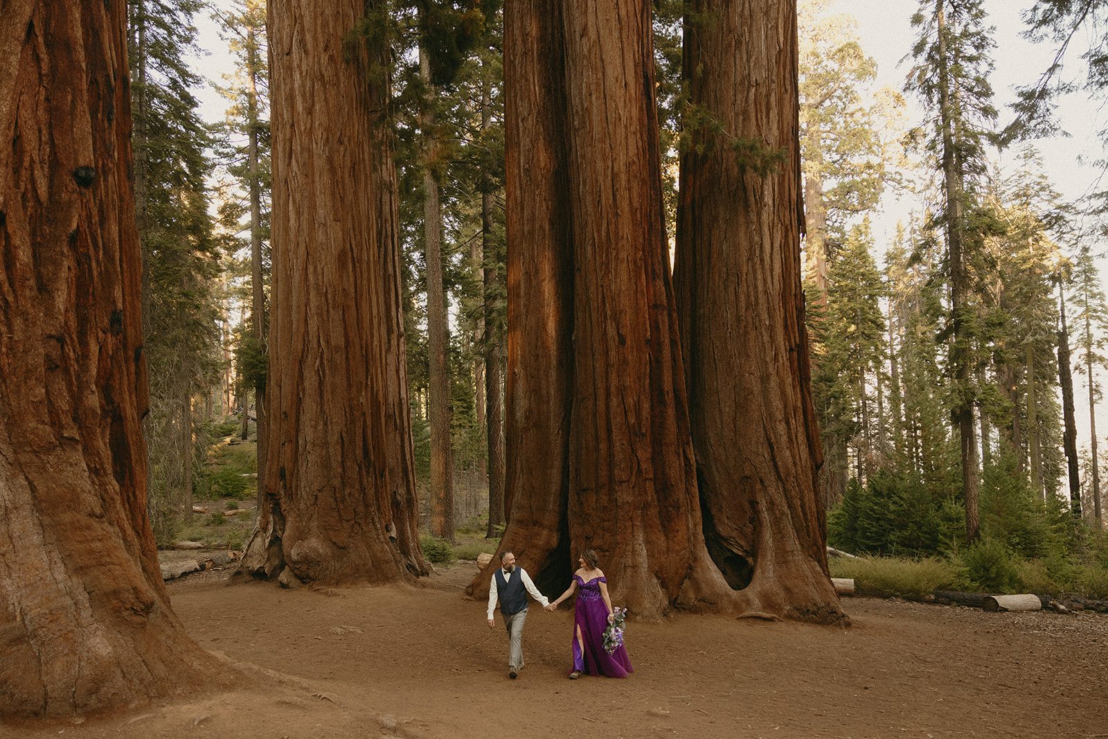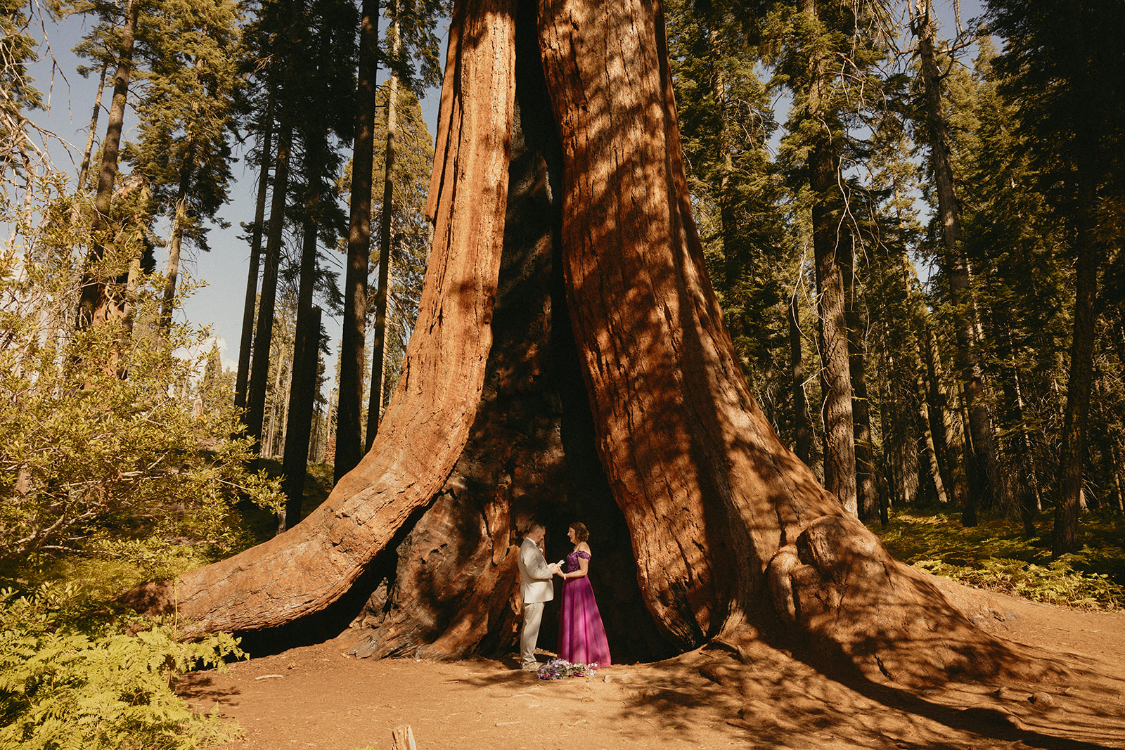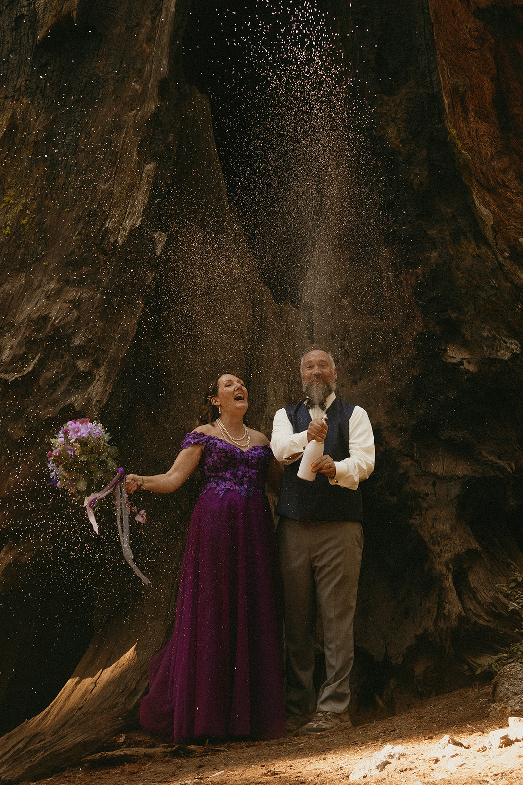 Lol of course there was tree hugging, we were in a forest with the biggest trees in the world after all! After Barbara and Ray said their vows, we wandered a little deeper into the greenery for portraits—and can I just say, I was obSESSED with Barbara’s purple gown. The way the vibrant shades of purple popped against the greenery all around us… 10/10 would recommend wearing a colorful elopement dress. Bonus points if you coordinate your color of choice with your florals like Barbara did, I was drooooling over the gorgeous purples, violets, and blues in her dreamy bouquet.