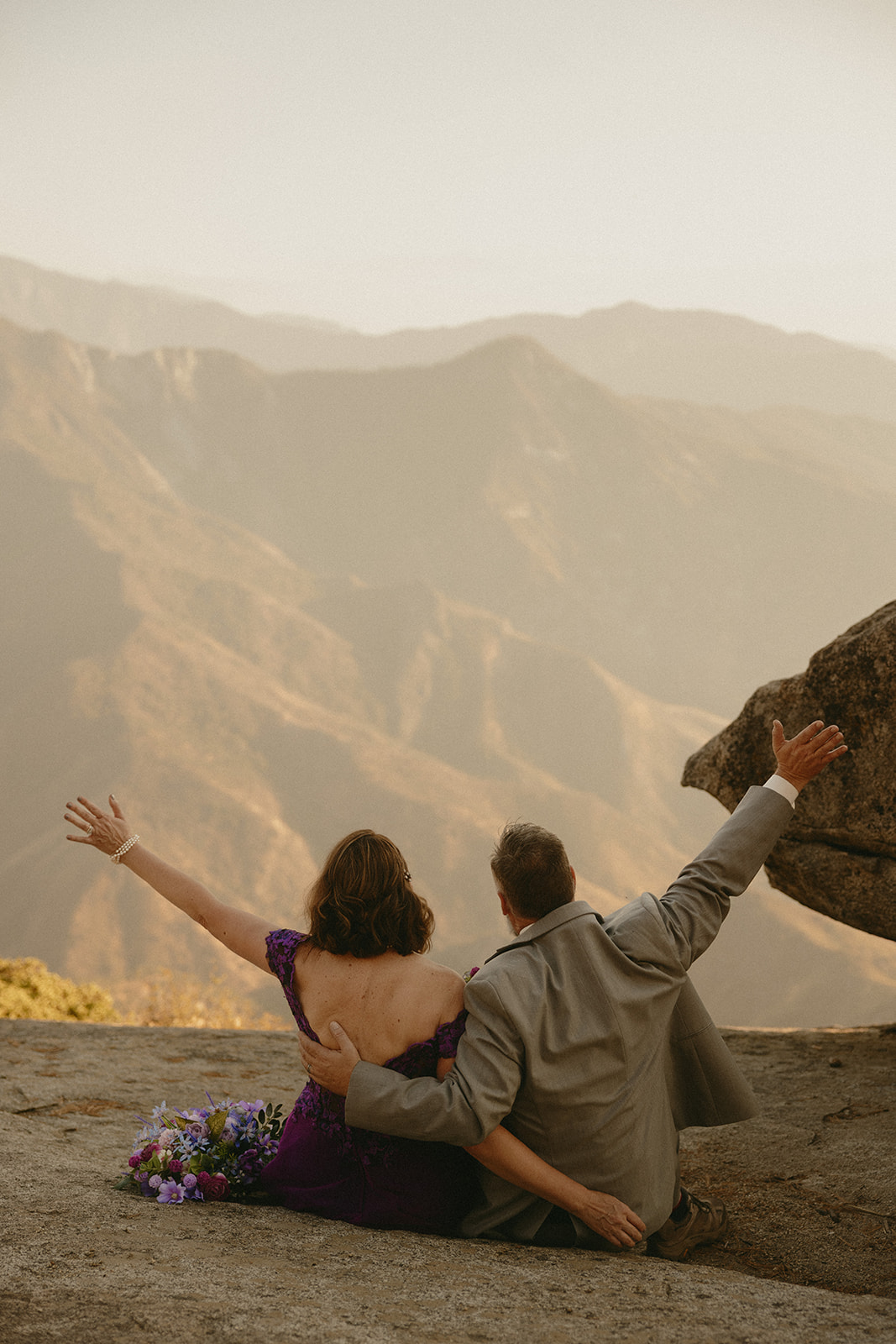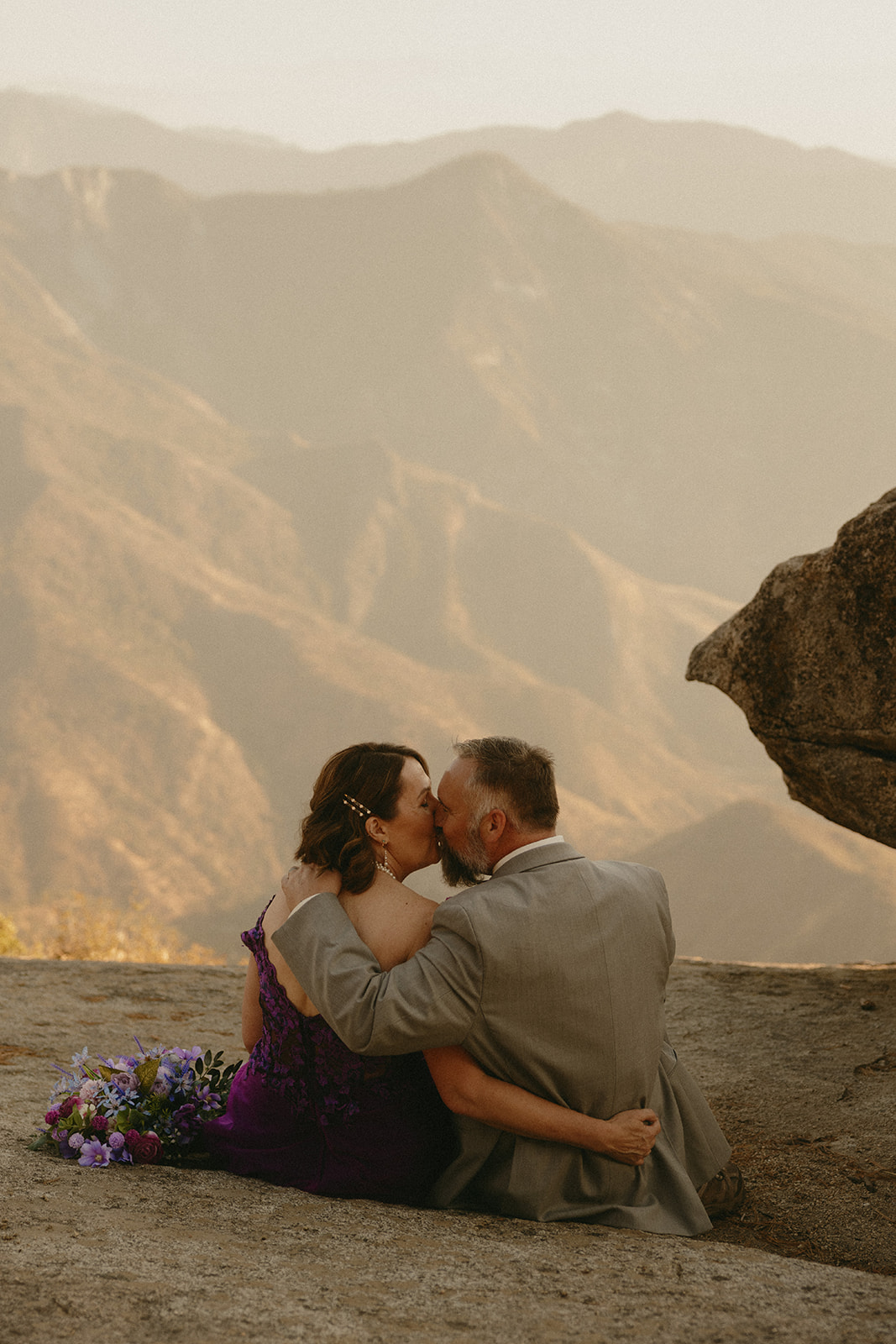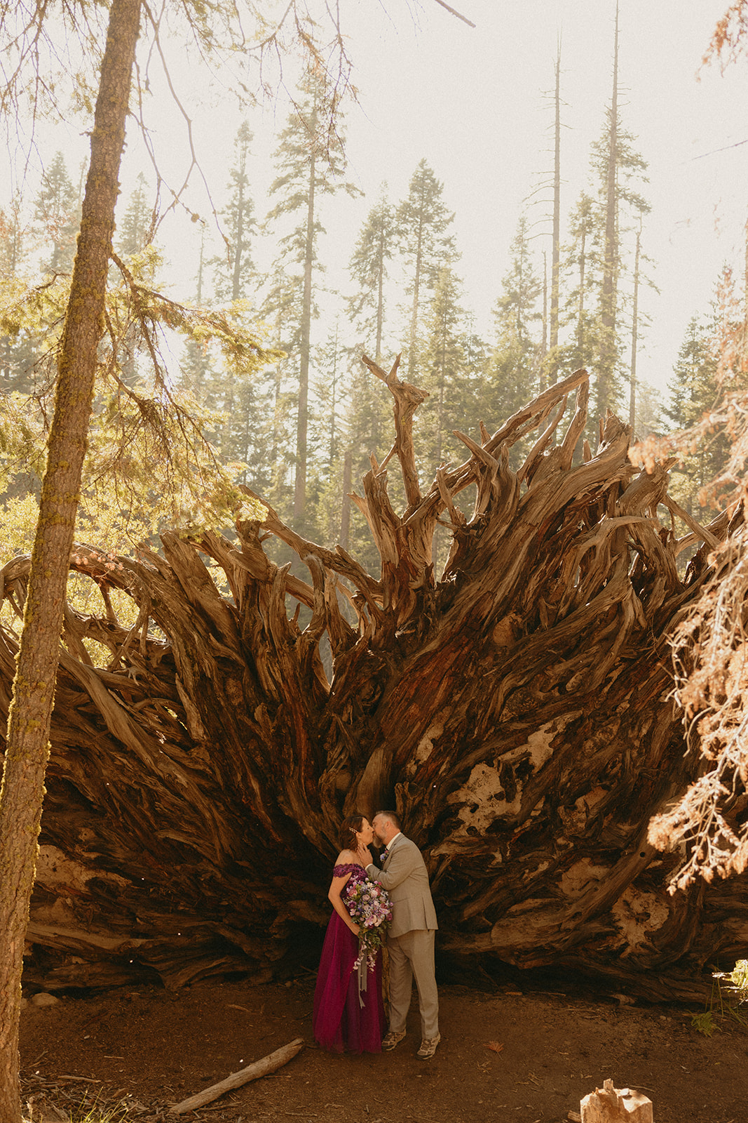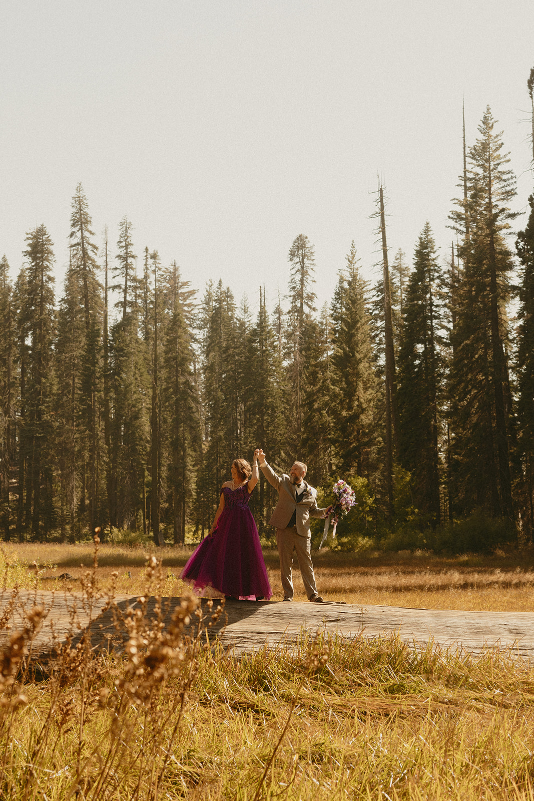 Lol of course there was tree hugging, we were in a forest with the biggest trees in the world after all! After Barbara and Ray said their vows, we wandered a little deeper into the greenery for portraits—and can I just say, I was obSESSED with Barbara’s purple gown. The way the vibrant shades of purple popped against the greenery all around us… 10/10 would recommend wearing a colorful elopement dress. Bonus points if you coordinate your color of choice with your florals like Barbara did, I was drooooling over the gorgeous purples, violets, and blues in her dreamy bouquet.