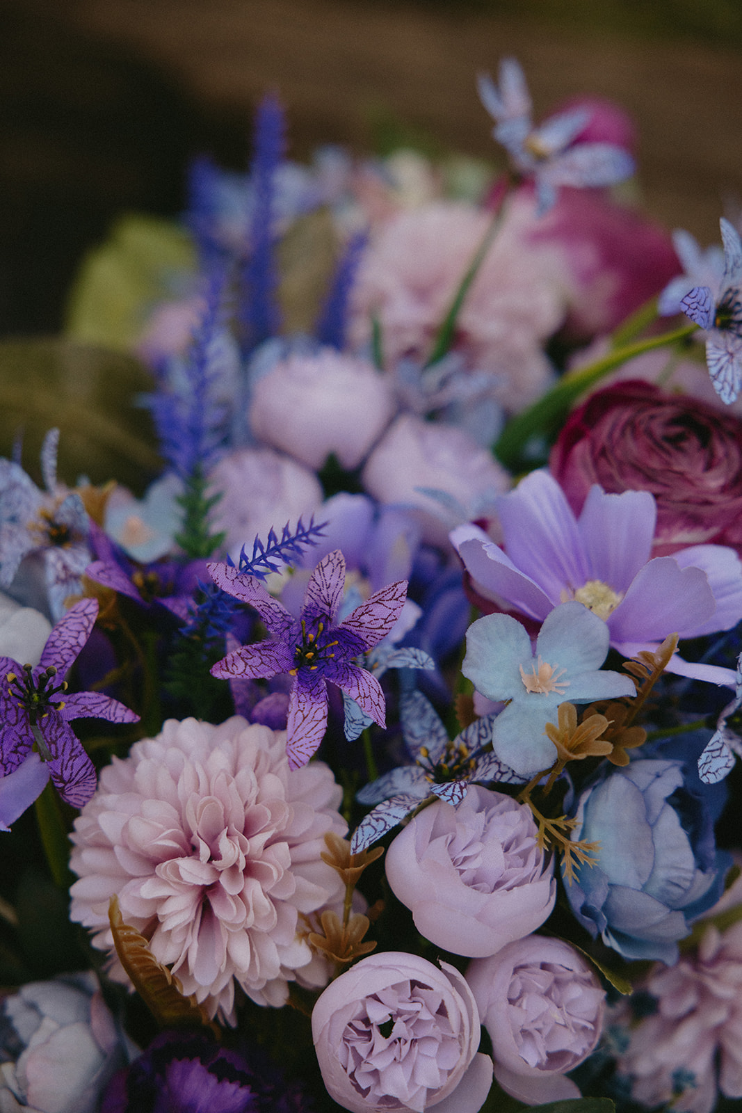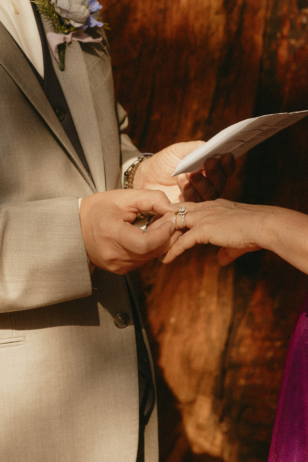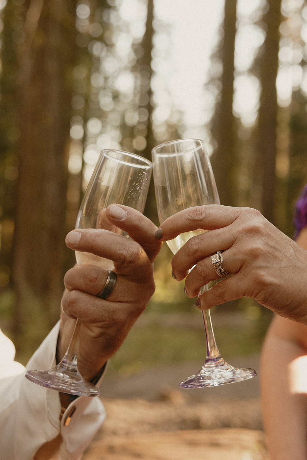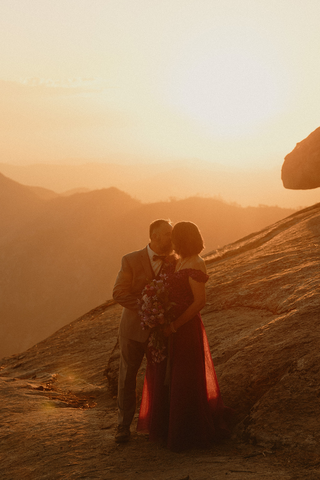 Lol of course there was tree hugging, we were in a forest with the biggest trees in the world after all! After Barbara and Ray said their vows, we wandered a little deeper into the greenery for portraits—and can I just say, I was obSESSED with Barbara’s purple gown. The way the vibrant shades of purple popped against the greenery all around us… 10/10 would recommend wearing a colorful elopement dress. Bonus points if you coordinate your color of choice with your florals like Barbara did, I was drooooling over the gorgeous purples, violets, and blues in her dreamy bouquet.