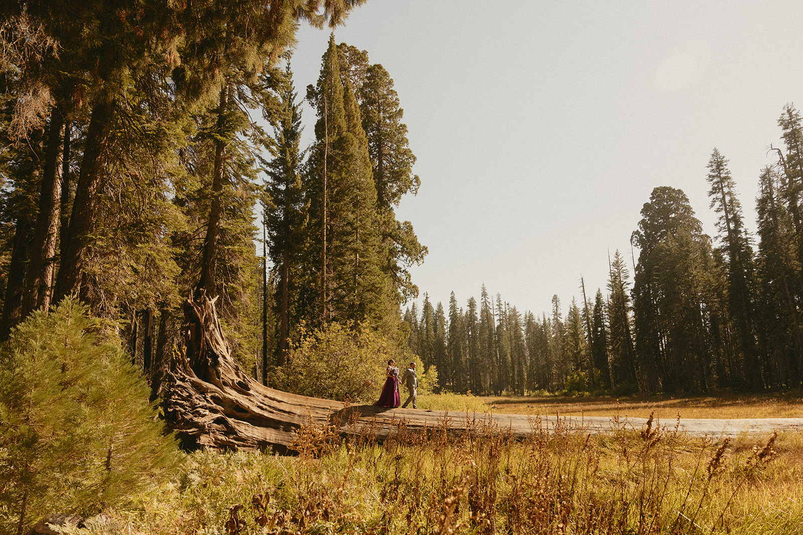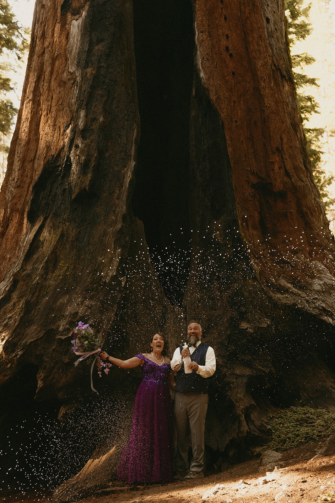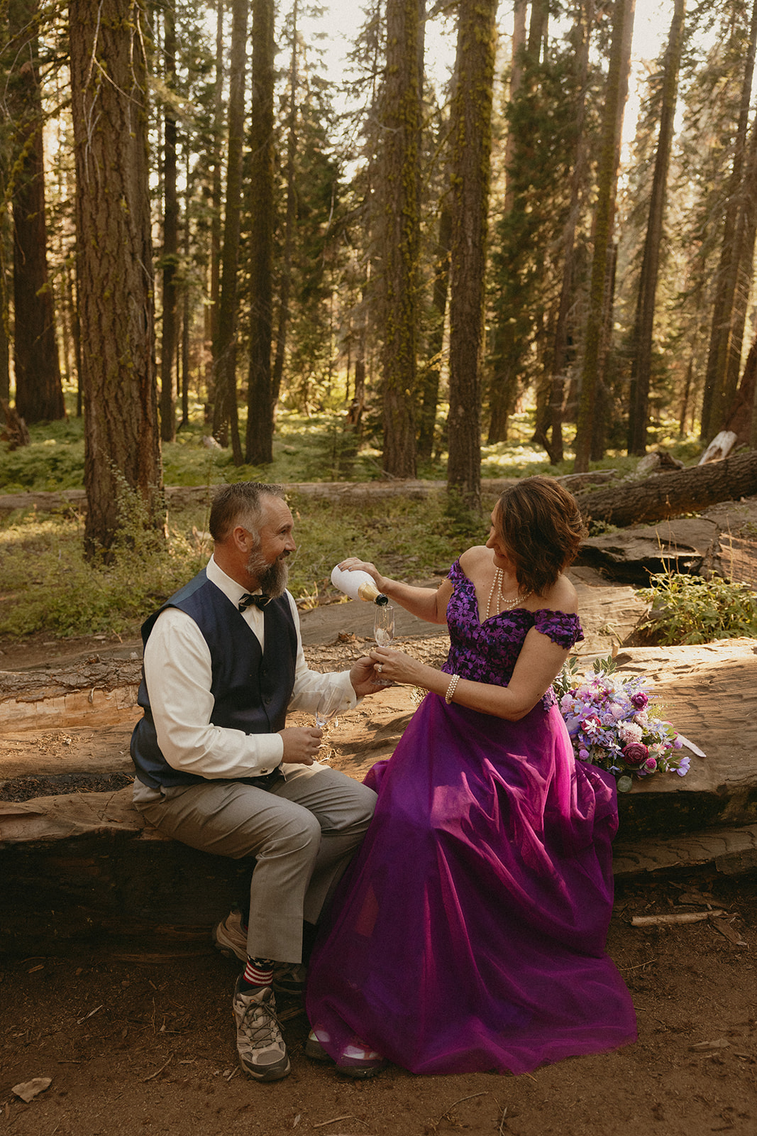 We found the perfect fallen tree to hang out at for a bit, where the newlyweds popped a bottle of champagne and toasted to the absolutely insane scenery they just got married amongst. There is seriously no cooler place to take elopement portraits than in, under, and next to these towering trees—especially the giant sequoias in the Parker Group that we admired for a while.